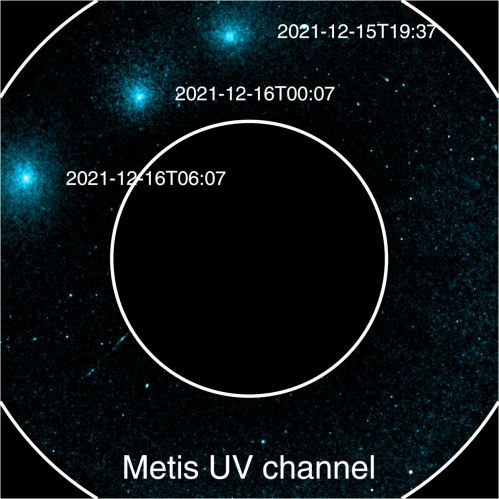 Metis ha acquisito immagini della cometa su un intervallo temporale di circa 12 ore, nella notte tra il 15 e il 16 dicembre. Le immagini nell’UV possono fornire importanti informazioni sull’attività della cometa, permettendo la stima del tasso di produzione dell’acqua. “La brillanza della cometa nella banda osservata da Metis è strettamente legata alla quantità di acqua che viene espulsa dal nucleo.” racconta Alain J. Corso, appartenente al team di ricercatori del Cnr-Ifn di Padova. “L’acqua emessa dal nucleo viene foto-dissociata dalla radiazione solare, producendo idrogeno neutro la cui quantità è direttamente stimabile dalla brillanza della cometa nella banda UV di Metis.” Le immagini polarimetriche nel visibile possono invece fornire informazioni preziose riguardo alla natura delle polveri che compongono la chioma e la coda. La luce solare che illumina la cometa viene diffusa dalle polveri emesse dal nucleo, ed il suo stato di polarizzazione è fortemente dipendente dalla densità e dalla dimensione di queste polveri. Inoltre, la simultanea osservazione sia nel visibile che nel UV permette studi comparativi della chioma, evidenziando l’estensione della sua componente di acqua e quella di polveri. Una possibilità che sfrutta a pieno le caratteristiche di Metis.