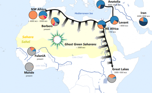 Rappresentazione delle componenti genetiche nelle genti di Green Sahara e nei Fulani |