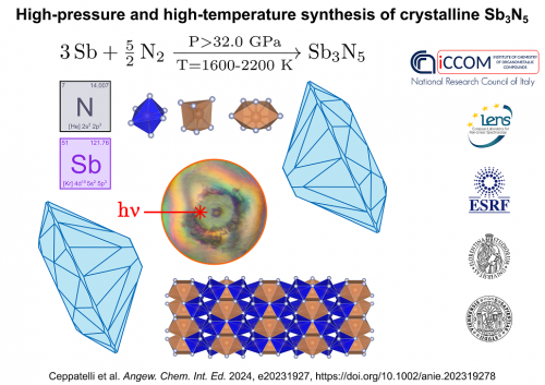 Il team ha usato celle a incudine di diamante per creare le condizioni di pressione, 32 GPa e radiazione laser infrarosso per alzare la temperatura 1.600-2.200 K. Ha quindi attivato la reazione chimica diretta tra antimonio elementare e azoto molecolare che ha permesso di sintetizzare per la prima volta un nitruro cristallino di antimonio. La struttura è determinata dalla diffrazione di raggi X da singolo cristallo a ESRF (Grenoble, Francia) dove è possibile eseguire questo tipo di misure in condizioni estreme di pressione.