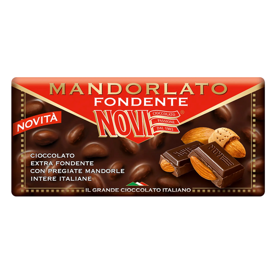 Per chi ama i sapori decisi, Novi propone la tavoletta Mandorlato Fondente: cioccolato extra fondente e mandorle intere, lavorate con una tostatura accentuata per esaltarne gusto e croccantezza. Senza glutine, con cacao selezionato e pregiate mandorle italiane, questa tavoletta regala un’esperienza intensa e autentica, con inclusione fino al 21% di frutta secca.